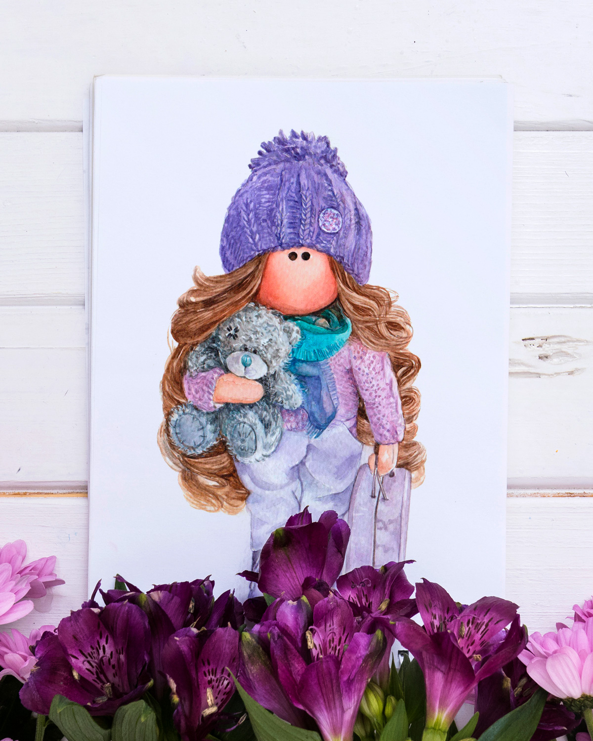 illustration aquarelle jouet tilda en casquette violette